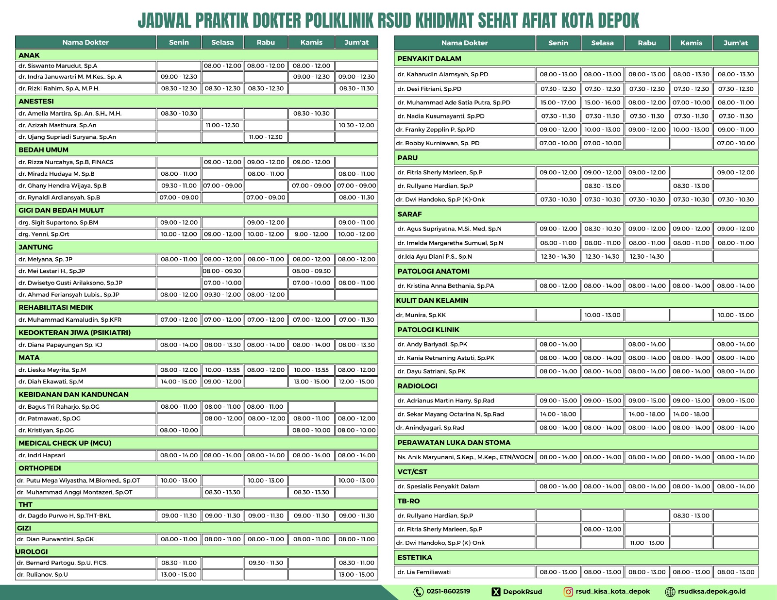 Untuk kemudahan dan kenyamanan Anda, kami informasikan jadwal pelayanan Poliklinik RSUD Khidmat Sehat Afiat Kota Depok untuk besok, hari Senin 12 Januari 2026.
