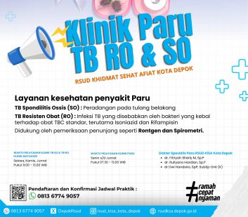 Kini RSUD Khidmat Sehat Afiat Kota Depok (KiSA) menghadirkan layanan Klinik Paru TB RO & SO untuk membantu masyarakat mendapatkan penanganan tepat terhadap penyakit paru, khususnya Tuberkulosis (TB).