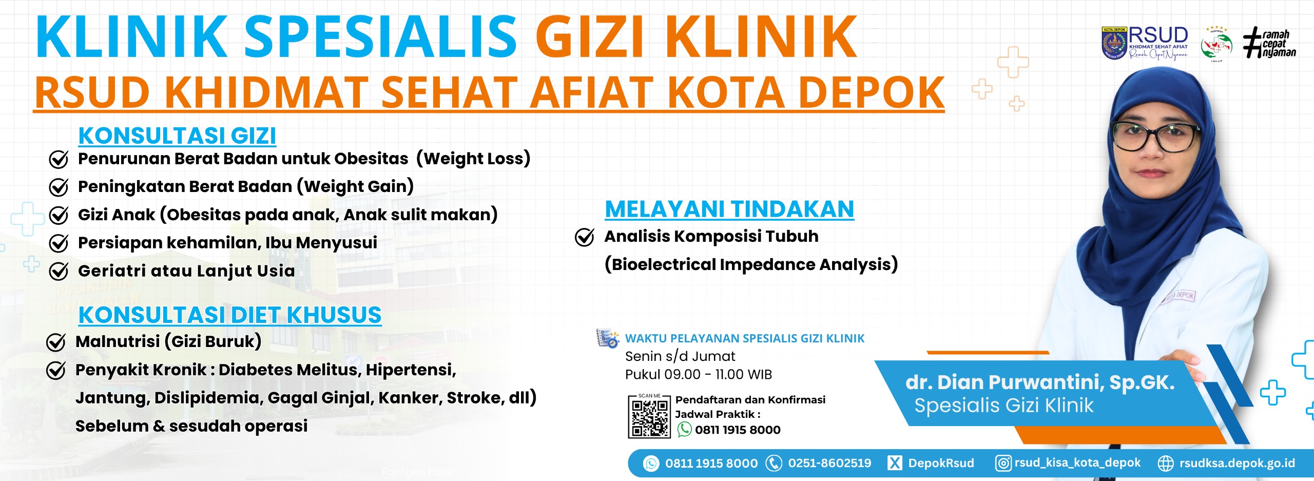 Punya masalah dengan berat badan, pola makan, atau kondisi kesehatan yang butuh pengaturan diet khusus? Yuk, konsultasikan bersama dr. Dian Purwantini, Sp.GK — Spesialis Gizi Klinik di RSUD Khidmat Sehat Afiat Kota Depok.