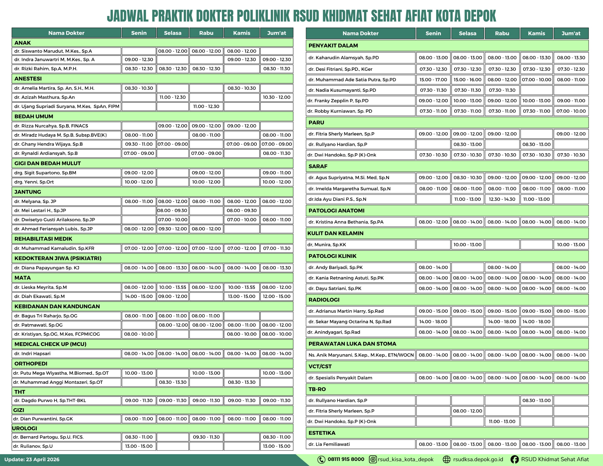 Untuk kemudahan dan kenyamanan Anda, kami informasikan jadwal pelayanan Poliklinik RSUD Khidmat Sehat Afiat Kota Depok untuk besok, hari Kamis 23 April 2026.