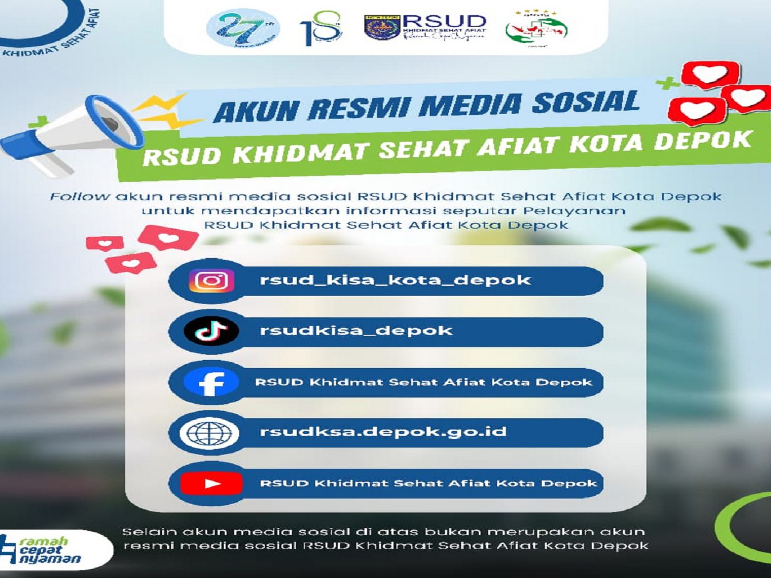 Untuk mendapatkan informasi resmi, akurat, dan terbaru seputar layanan kesehatan, program, serta kegiatan dari RSUD Khidmat Sehat Afiat Kota Depok, yuk follow akun media sosial resmi kami!