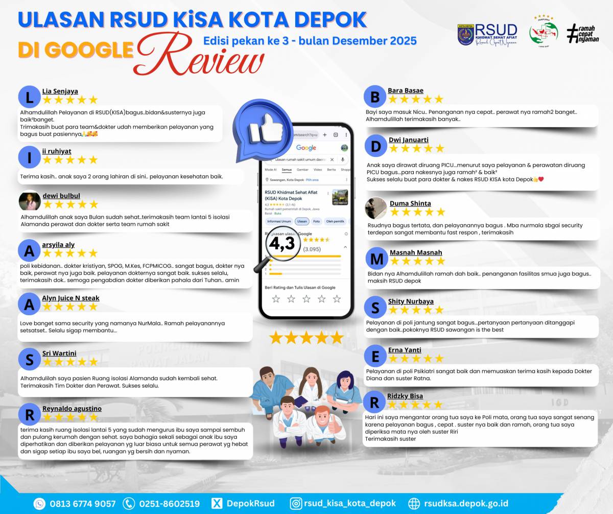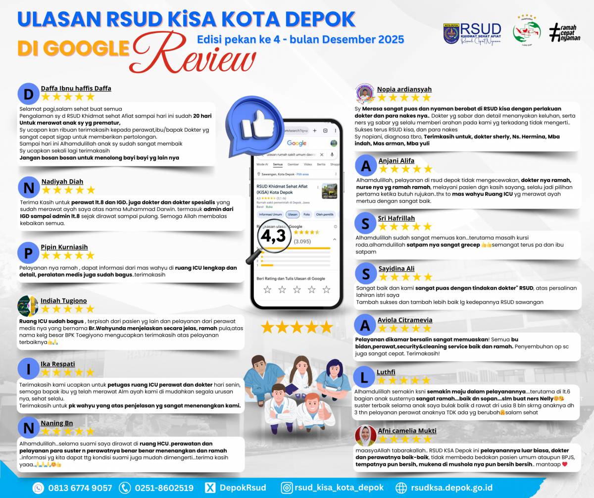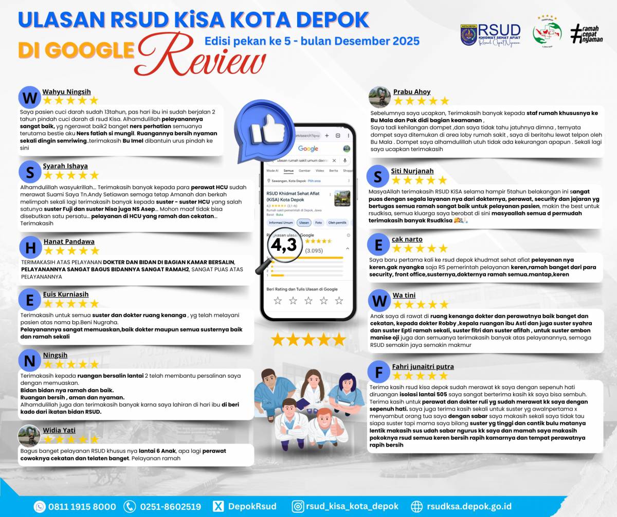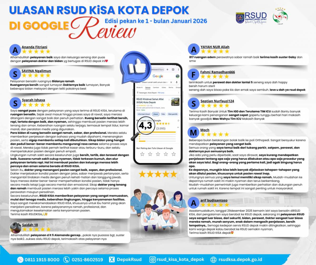 Terima kasih kami sampaikan kepada seluruh masyarakat atas kepercayaan, doa, dan ulasan positif yang diberikan kepada RSUD KiSA Kota Depok melalui Google Review. Setiap masukan dan apresiasi menjadi penyemangat bagi kami untuk terus meningkatkan kualitas pelayanan kesehatan.